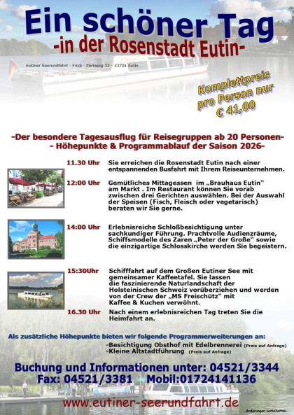 Das gemeinsame Mittagessen in der Privatbrauerei am Eutiner Marktplatz, eine faszinierende Führung im Eutiner Schloss sowie eine erlebnisreiche Schiffahrt über den großen Eutiner See mit einer großen Kaffeetafel an Bord von MS Freischütz bieten wir Ihnen zum Pauschalpreis von nur € 41,00 an.