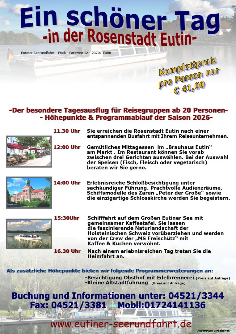 Ein besonderes Erlebnis für Gruppen, Vereine und Busgesellschaften ab 20 Personen ist unser Pauschalangebot "Ein schöner Tag in der Rosenstadt Eutin".